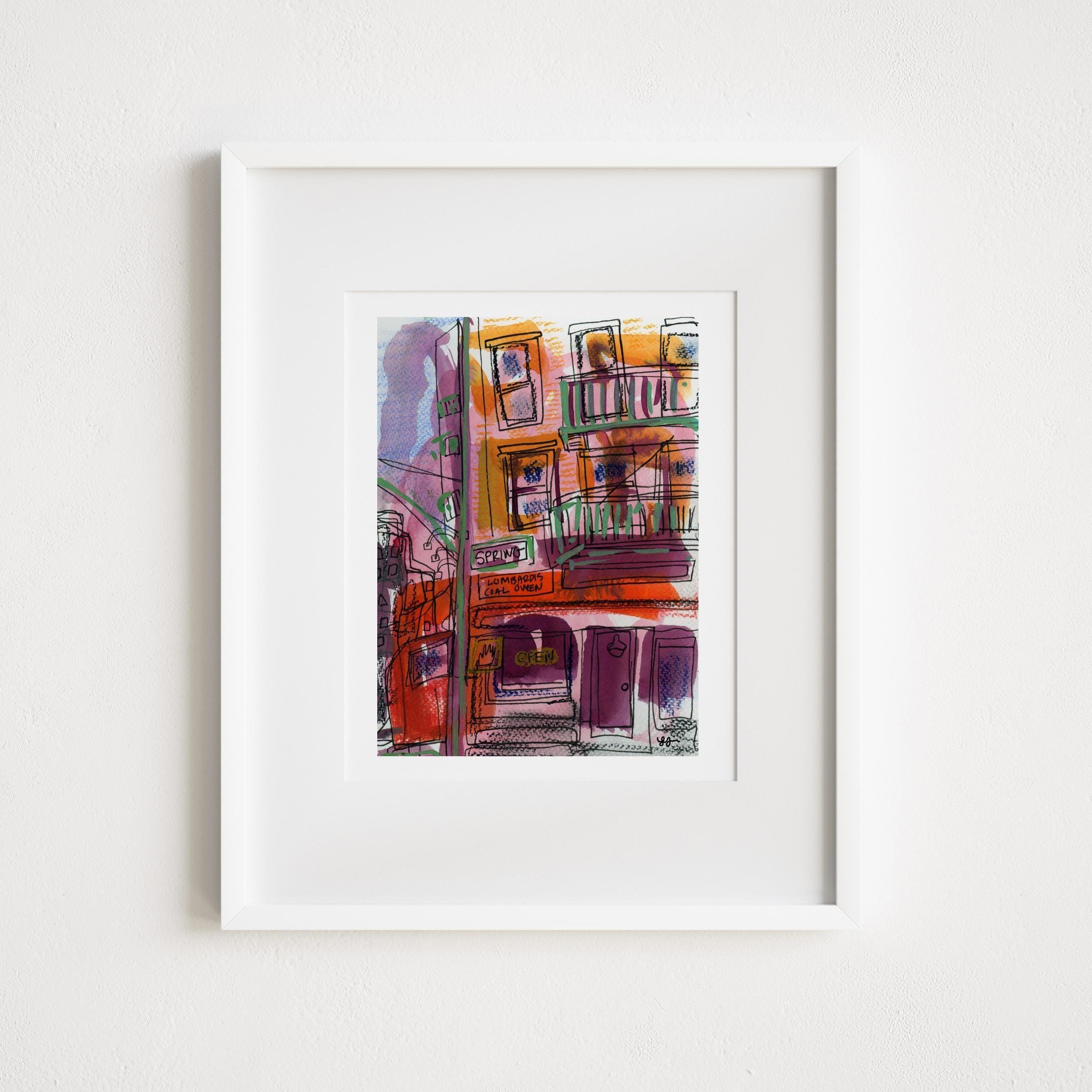 This is a print of a painting of Lombardi's Pizza on Spring Street in Manhattan.