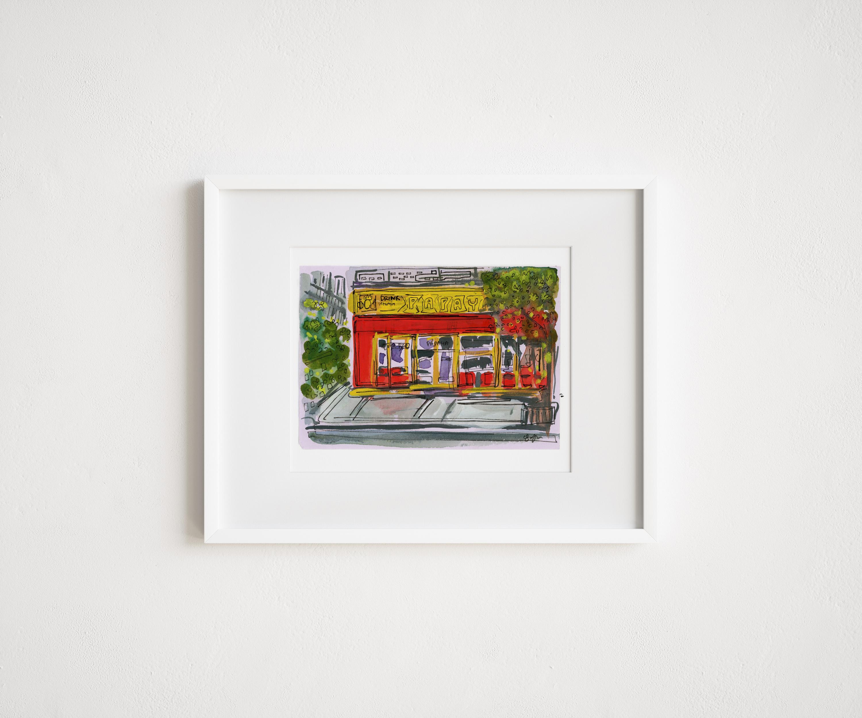 This is a print of a mixed media painting of Papaya King on the UES at 86th street.