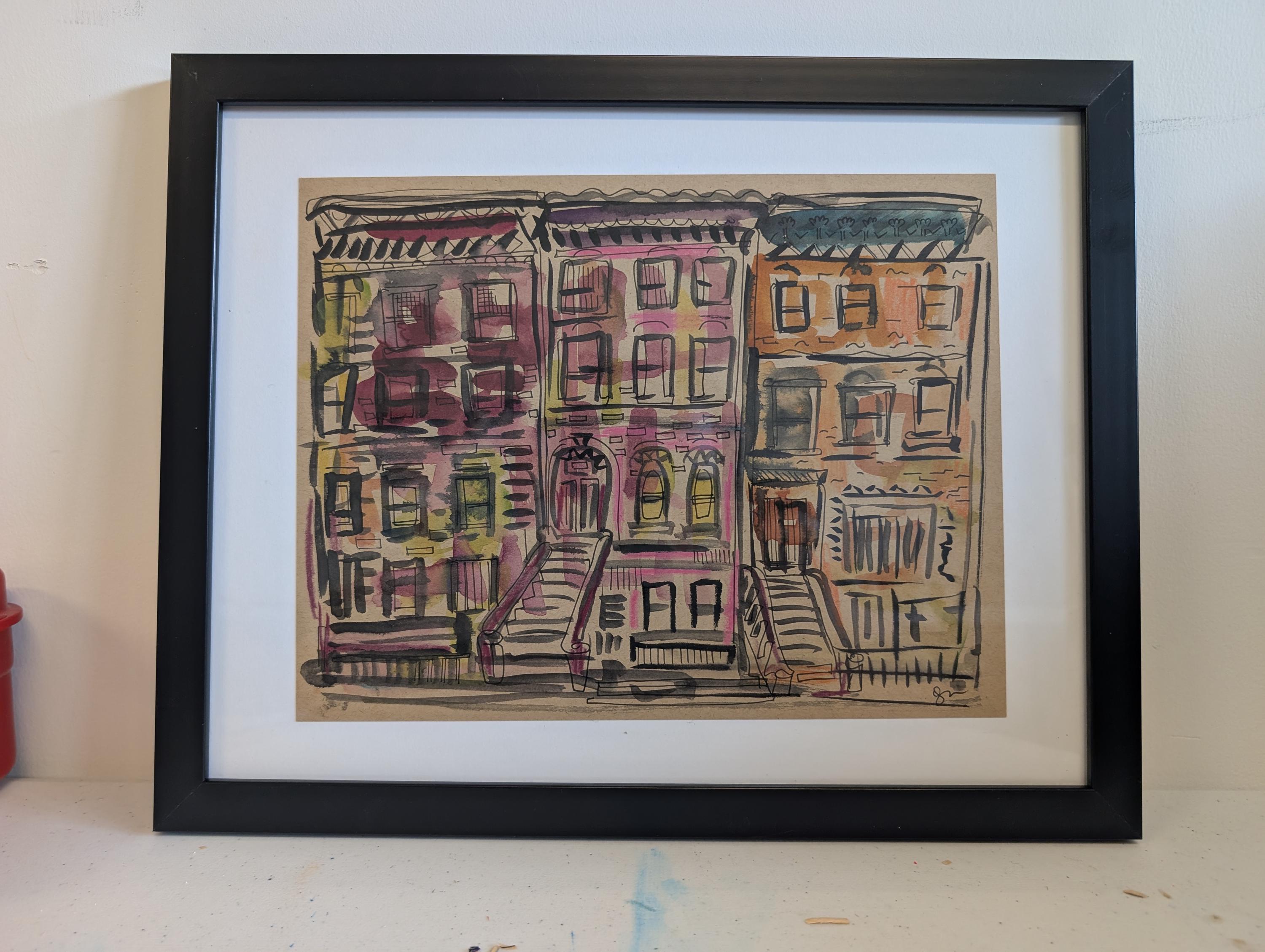 This is an original mixed-media painting of brownstones in Brooklyn. It comes floated in a black wood frame.