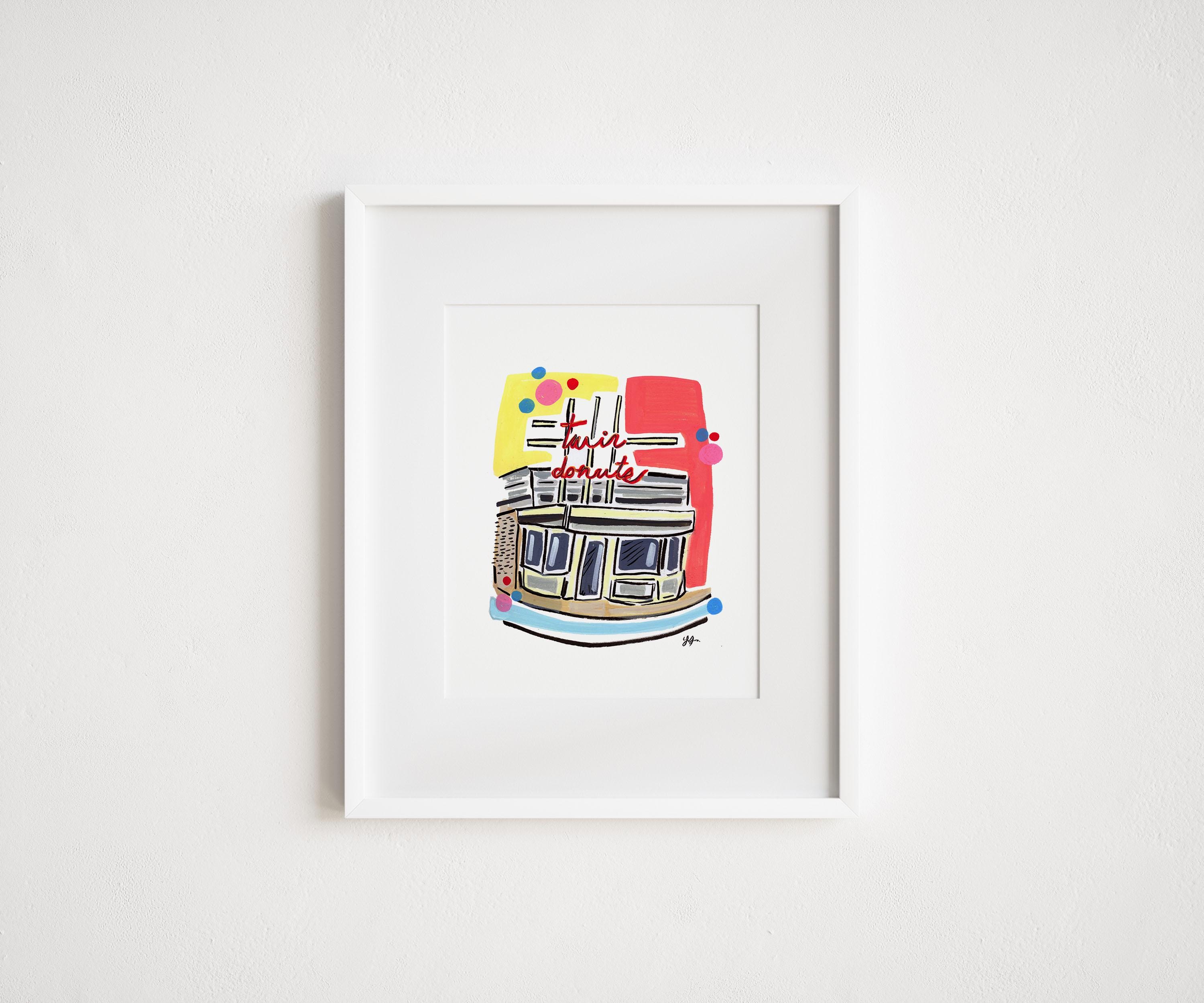 A colorful, hand-drawn illustration of the beloved Twin Donuts in Allston, Massachusetts, an iconic neighborhood landmark.
