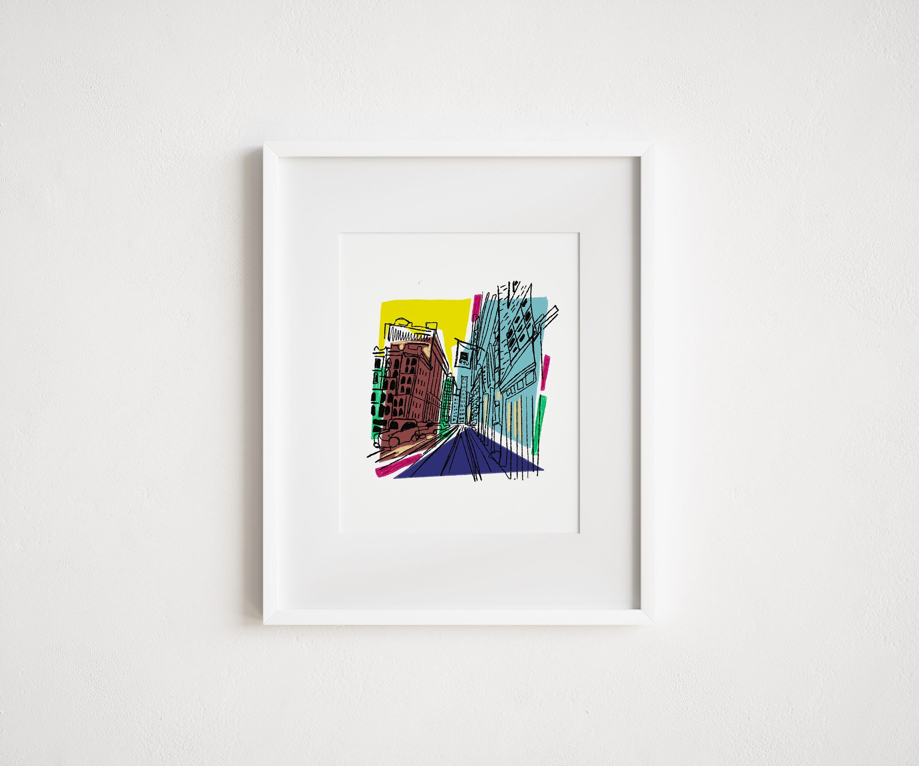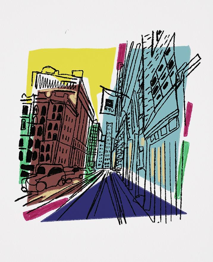A colorful illustration of downtown NYC near NYU, blending architecture and movement through expressive lines. Perfect for lovers of New York streets and modern urban art.