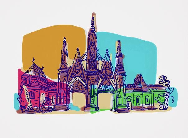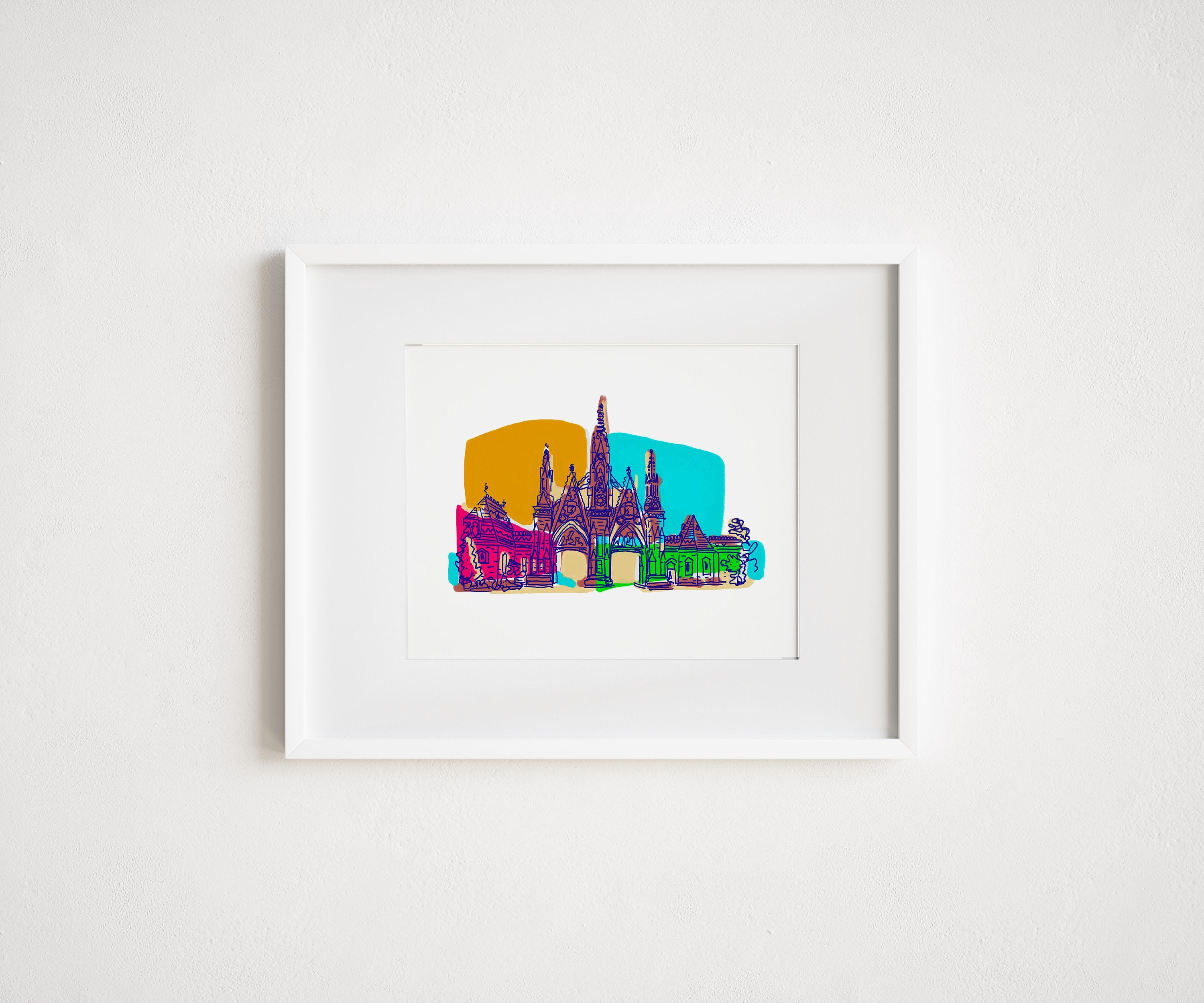 This vibrant art print features the iconic Gothic entrance of Greenwood Cemetery in Brooklyn, New York, illustrated in expressive line and layered with bold blocks of teal, gold, pink, and green. The piece blends historic architecture with playful color, creating a modern interpretation of a beloved New York landmark.