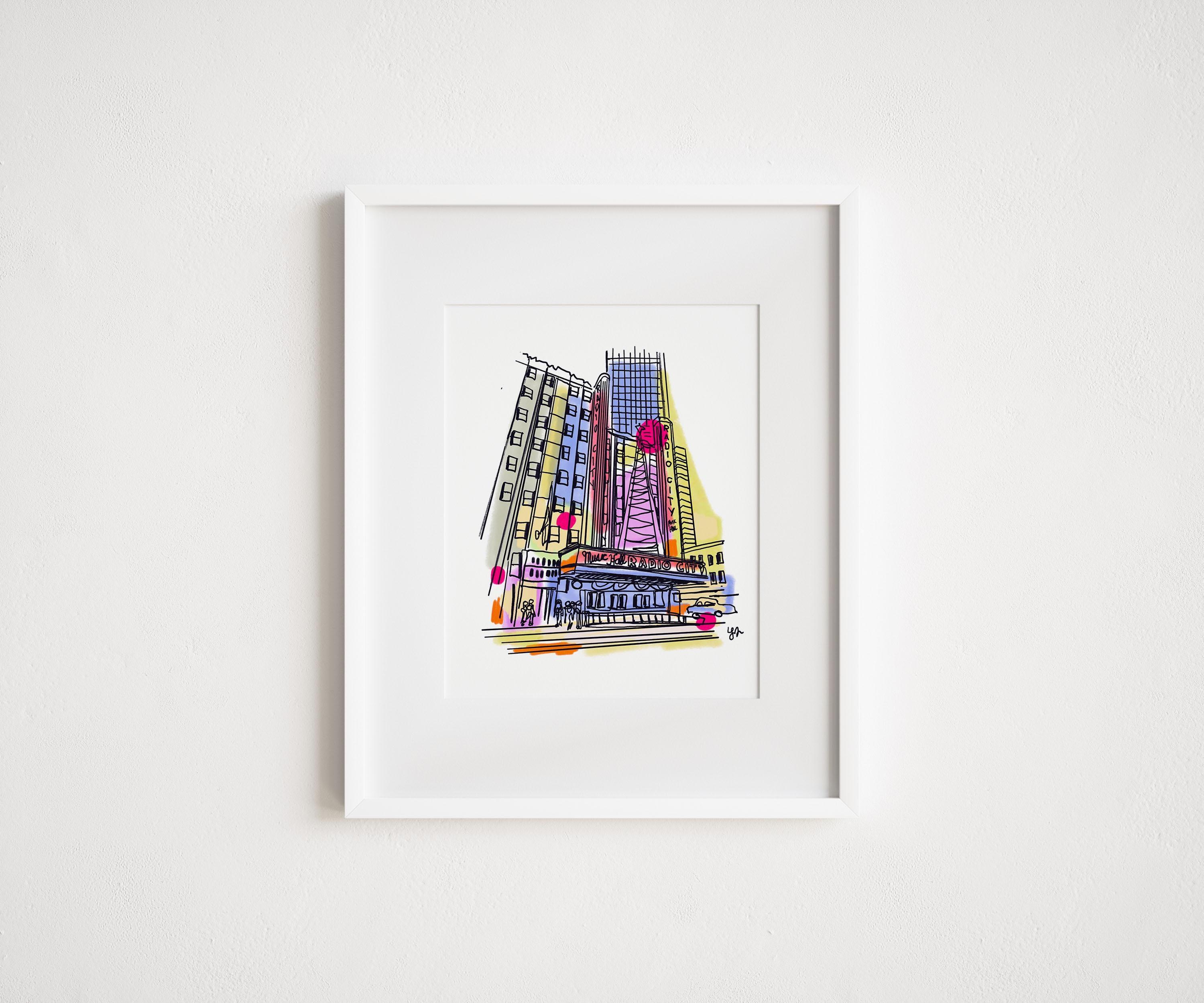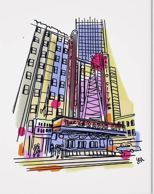 A vibrant illustration of Radio City Music Hall, one of New York City’s most iconic landmarks. This piece captures the towering Art Deco architecture of the theater with loose ink linework and bright washes of color that evoke the energy of Midtown Manhattan.