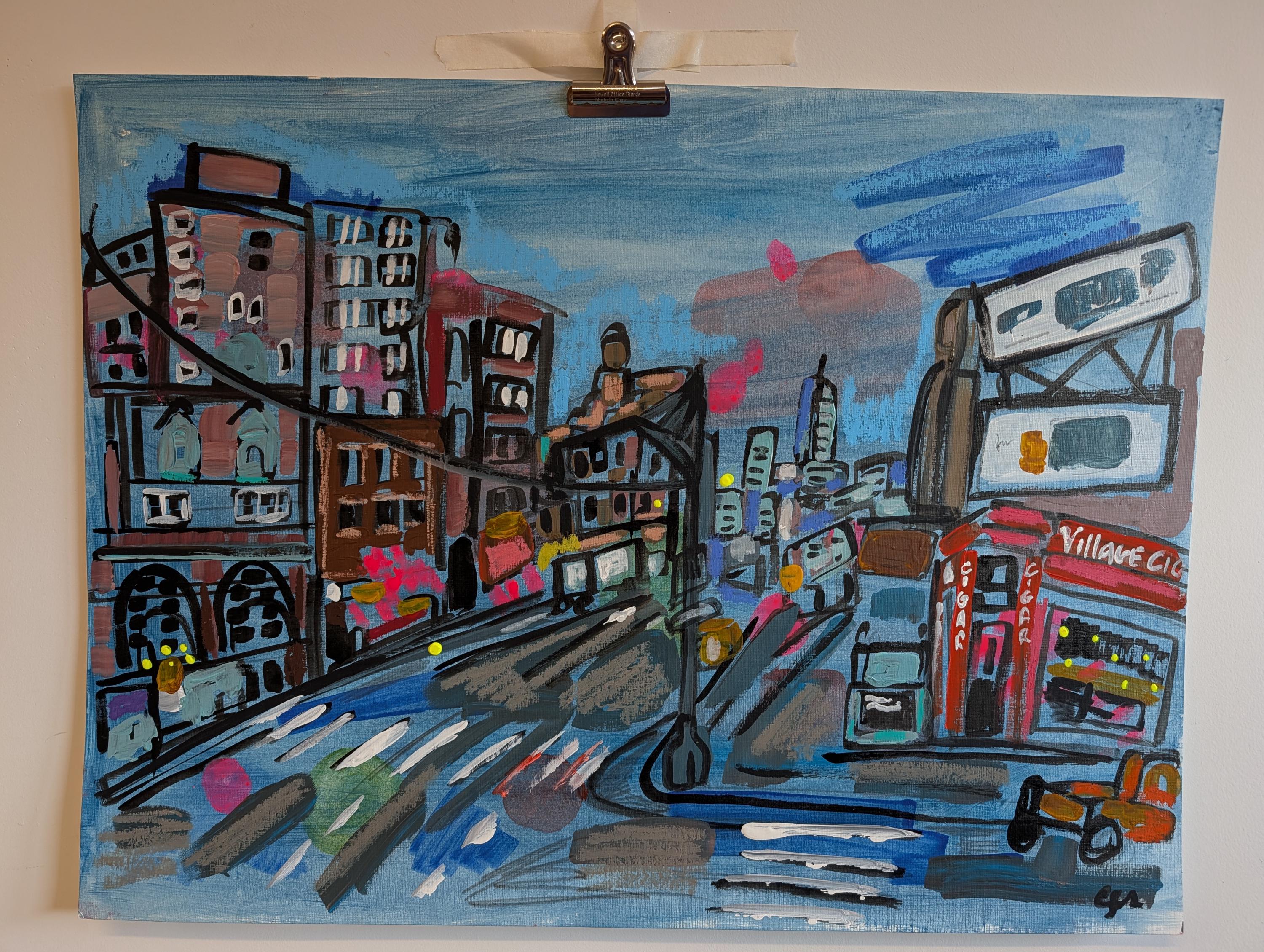 This is a mixed media work titled "Looking Down 7th Avenue." It's done in mixed media on blue-toned paper. The paper is 24 wide and 18 high.