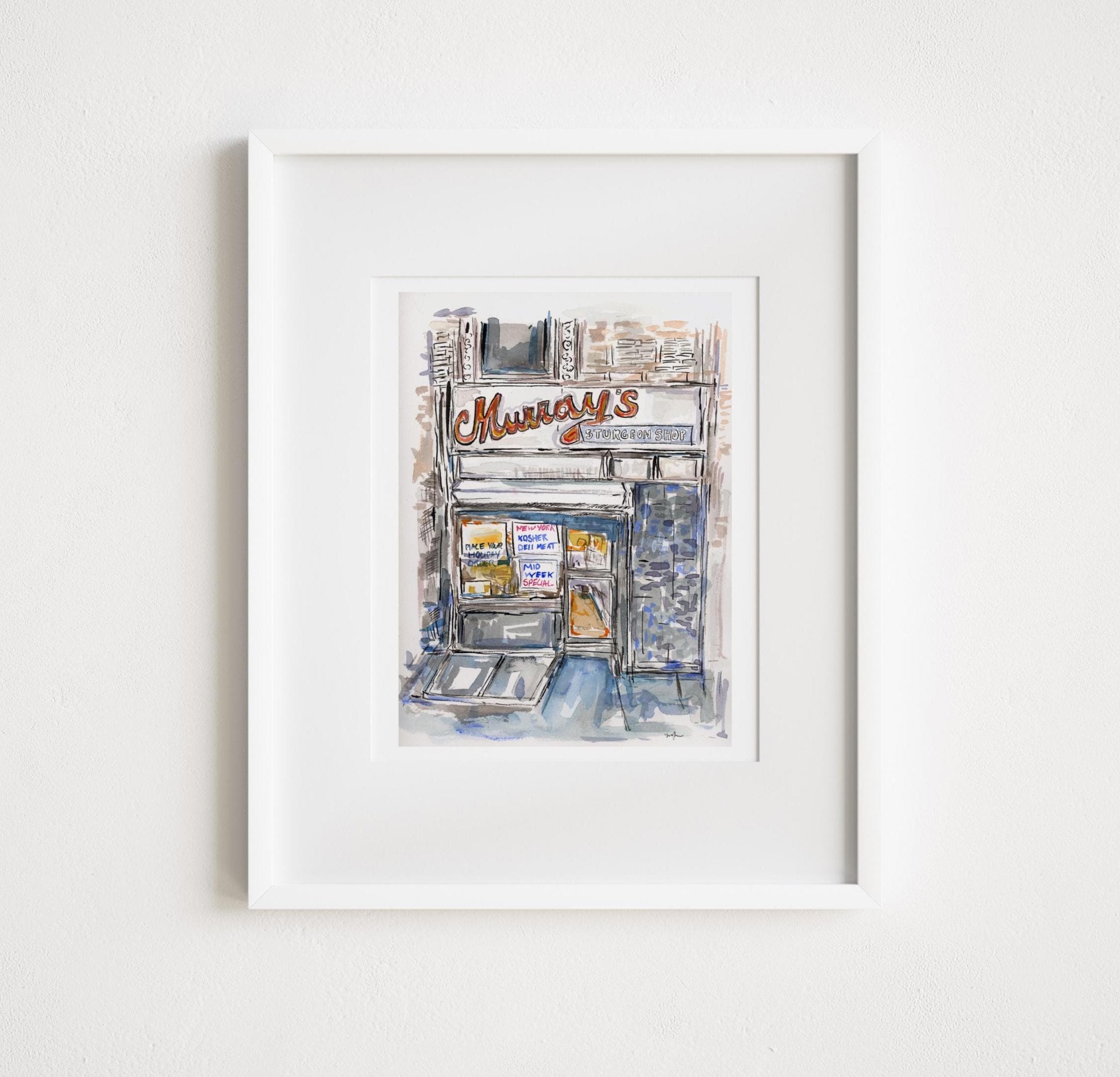 This is a print of an original watercolor painting of Murray's Sturgeon Shop on the Upper West Side of Manhattan. As an artist I love painting the frenetic and changing life of New York City storefronts and buildings.