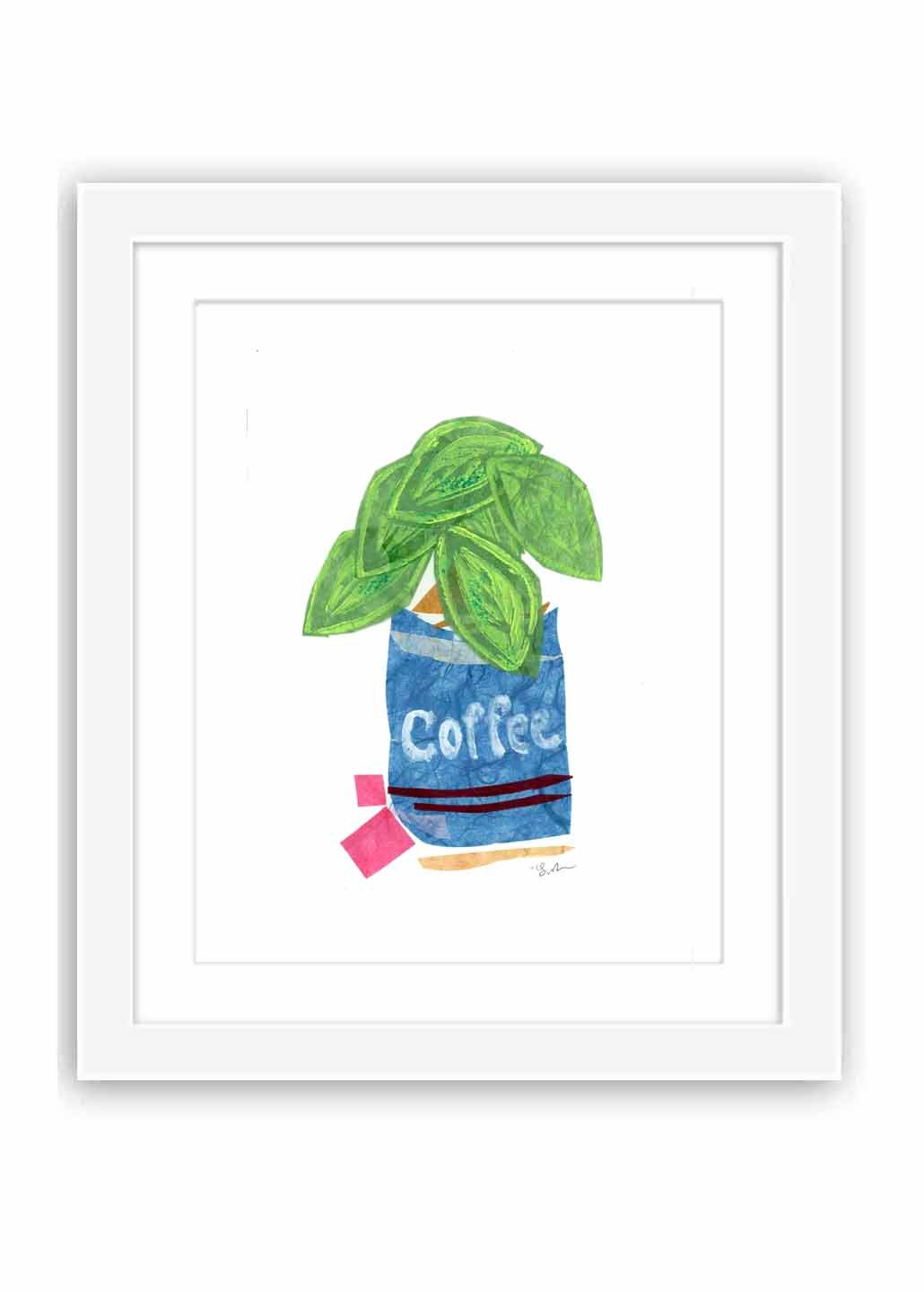 This is a print of a mixed media collage. It's inspired by a house plant I have in an old coffee tin.