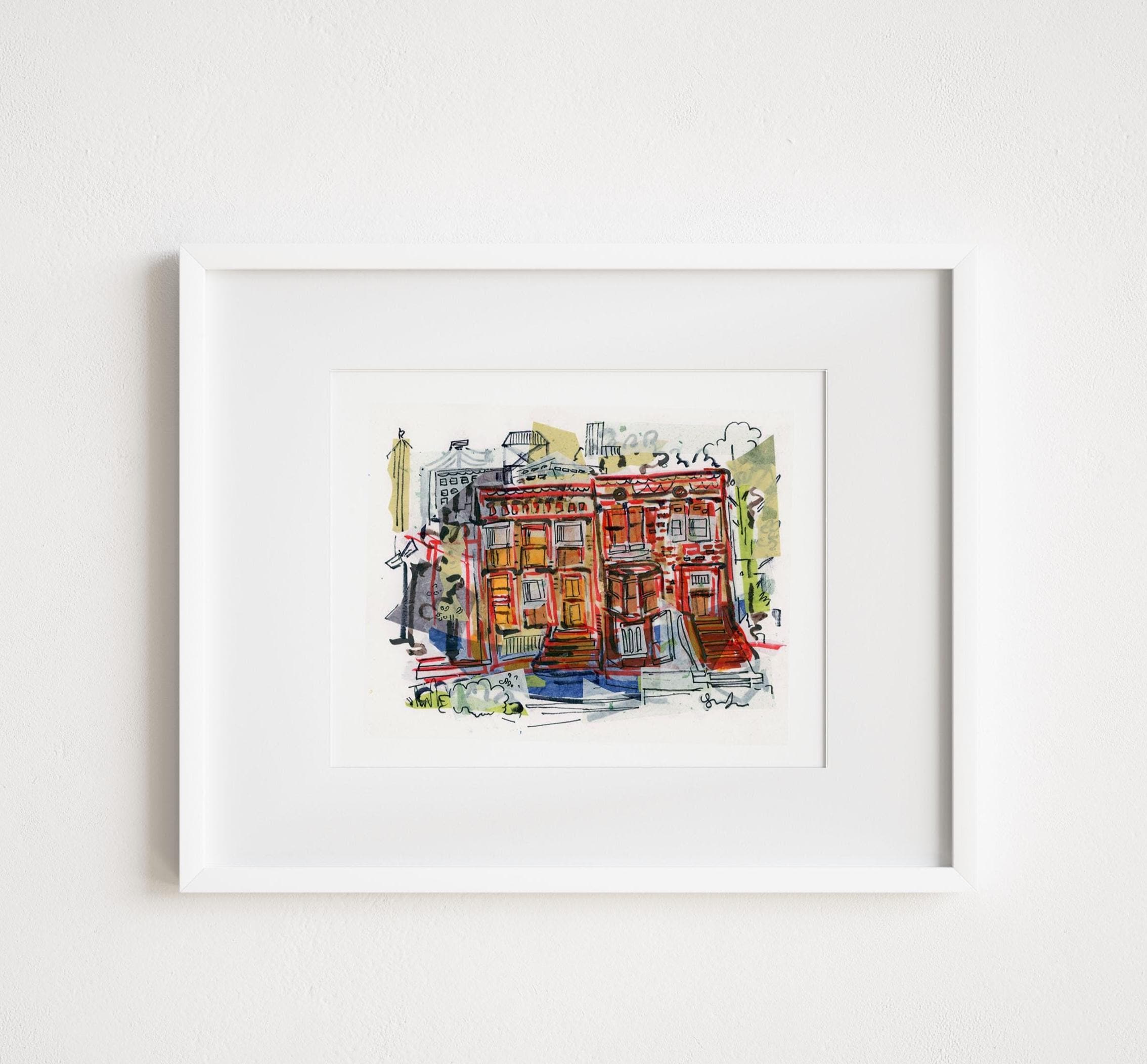 This is an 8 x 10 print of a Windsor terrace brownstone scene done in a mixed media collage of ink and rice paper. I love the quiet blocks in this Brooklyn neighborhood particularly.