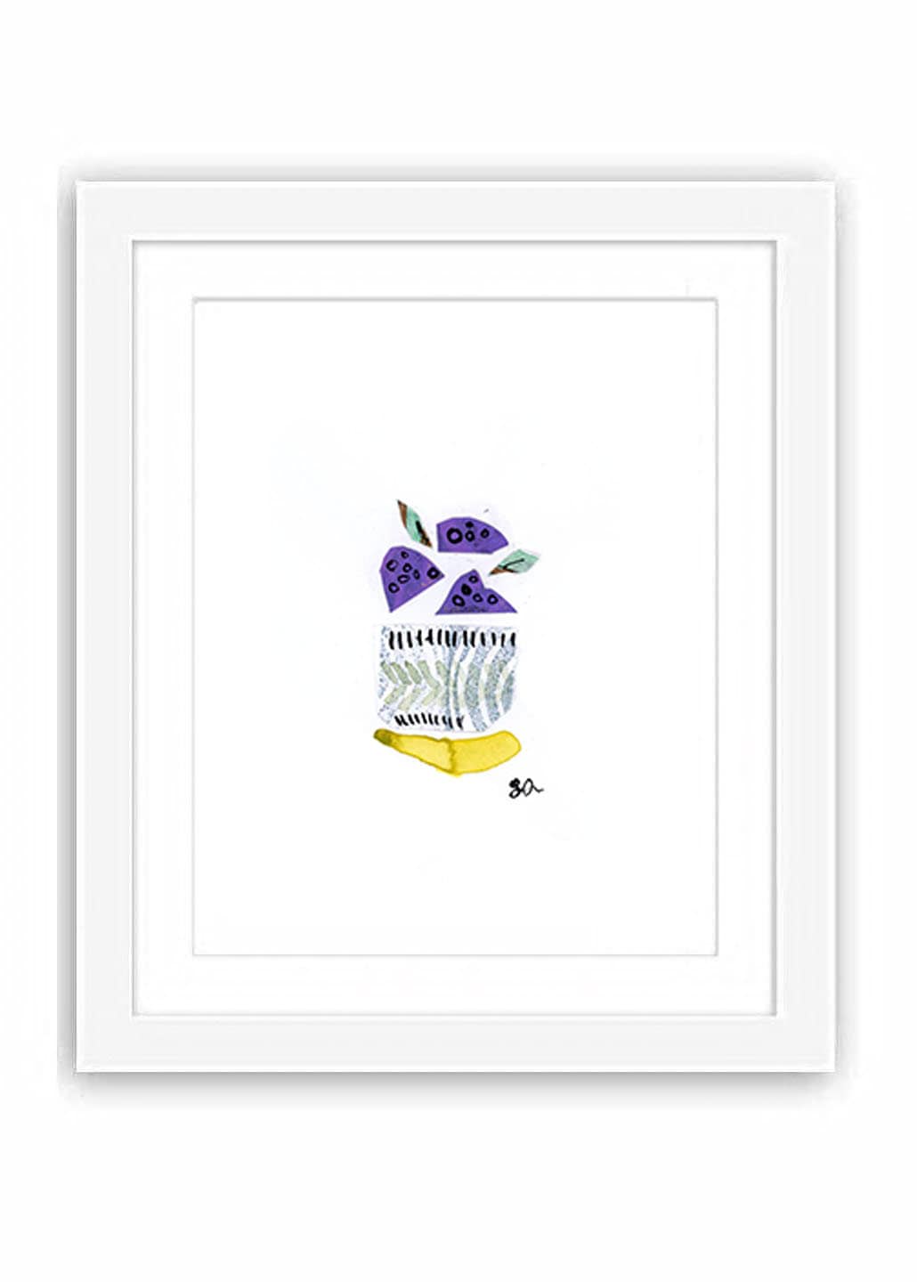 This is a print of a watercolor and collage illustration of a bowl of raspberries.