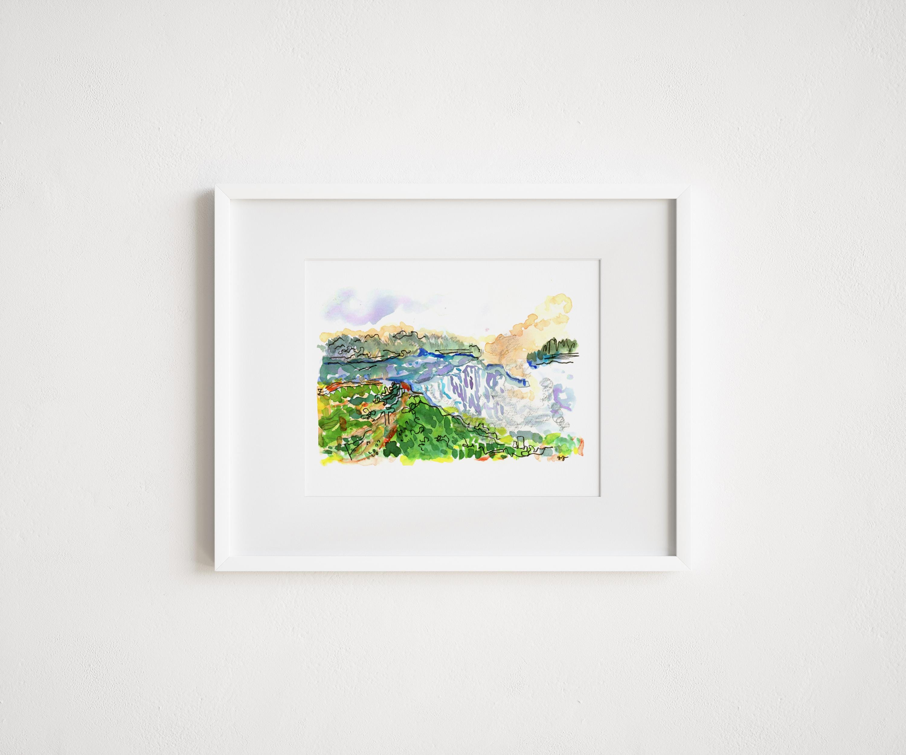 This is a print of a watercolor painting of a Niagara Falls in Western New York.