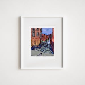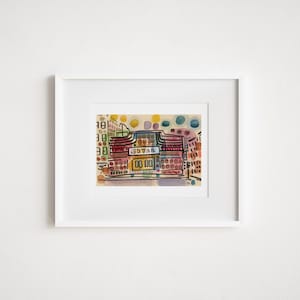 This is a print of taxis rushing by the Flatiron Building near Madison Square Park. It's done in watercolor, gouache, & oil pastels.
